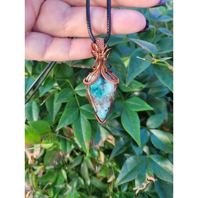 The Chrysocolla is expertly wrapped in antique copper, adding a touch of vintage flair to this modern accessory. The warm tones of the copper beautifully complement the cool colors of the stone, creating a harmonious balance that is sure to catch the eye. Whether you're dressing up for a special occasion or adding a touch of style to your everyday outfit, this necklace is versatile enough to suit any look.