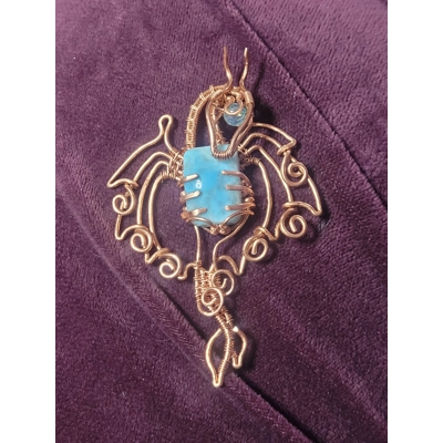 Introducing our stunning Copper Dragon With Larimar, a unique piece that beautifully combines the mystical allure of dragons with the calming energy of Larimar. This handcrafted dragon wire wrap pendant is not just a decorative item; it's a symbol of strength, wisdom, and tranquility.